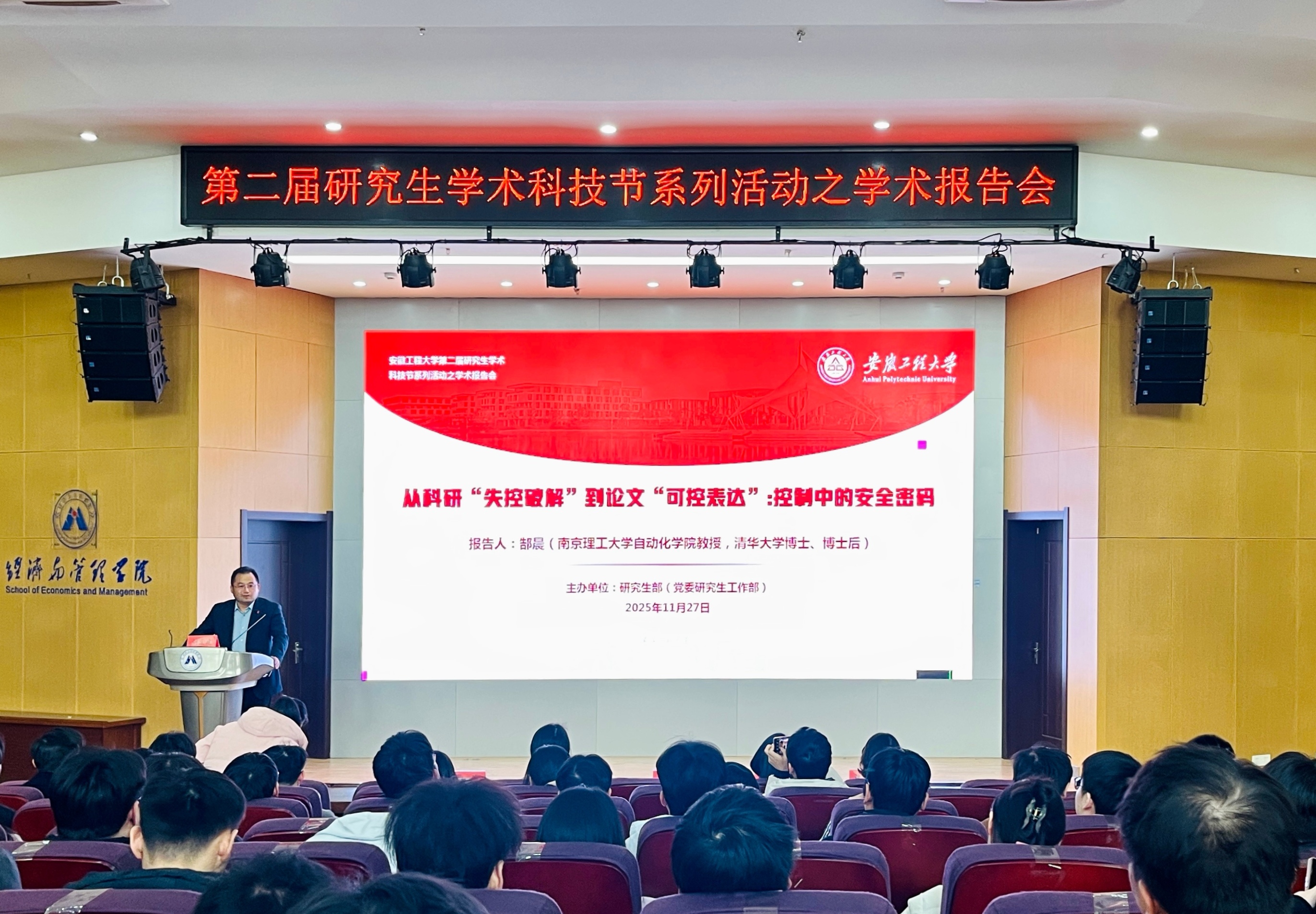 11月27日下午,南京理工大学郜晨教授应邀来校,作了题为“从科研‘失控破解’到论文‘可控表达’—控制中的安全密码”的学术报告。报告会由研究生部副主任刘宏建主持,党委研工部部长周伟、研究生辅导员、校理工类专业研究生参加了报告会。