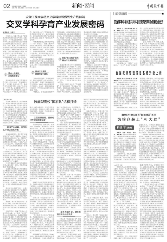 近日,《中国教育报》以《交叉学科孕育产业发展密码》为题,专题报道我校交叉学科服务地方产业发展的创新举措与显著成效。报道全面展示了我校立足芜湖“省域副中心城市”的产业发展定位,通过打破传统学科壁垒,构建多学科交叉融合的协同创新体系,推动教育资源与产业需求精准对接的生动实践。