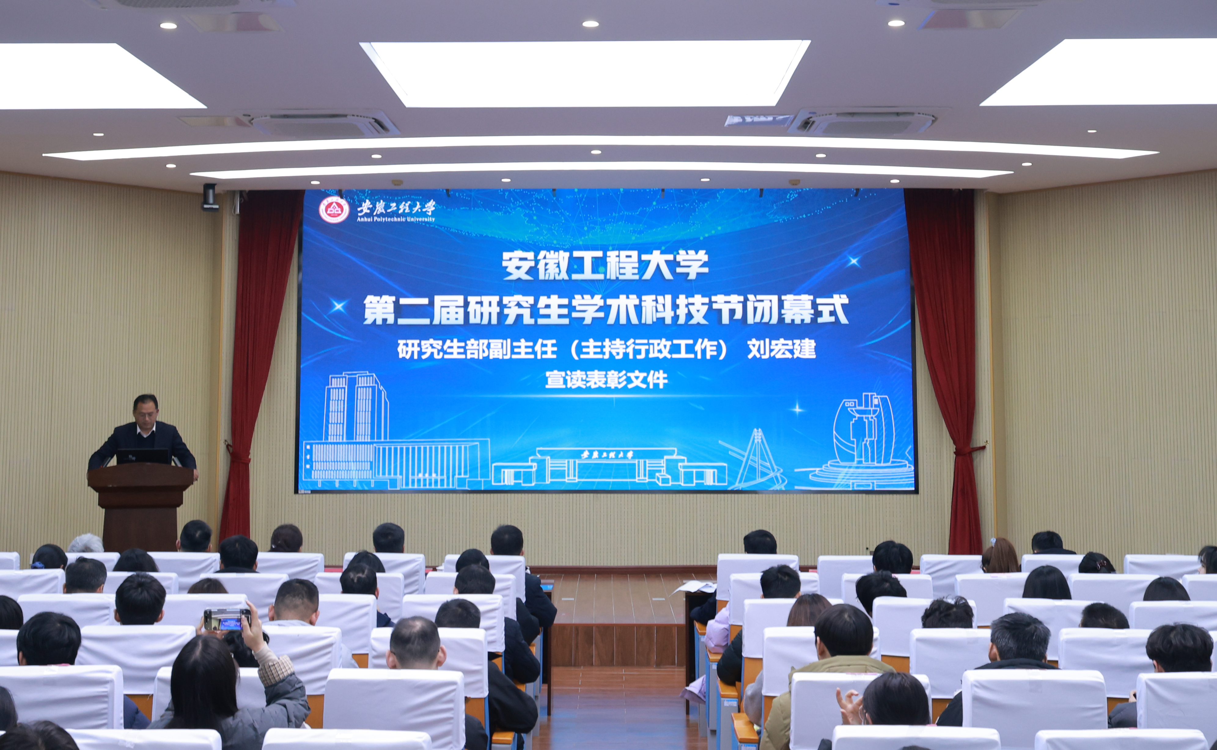 研究生部负责人刘宏建宣读了表彰文件。他对本次学术科技节取得的丰硕成果给予充分肯定,向斩获佳绩的学院与学生致以诚挚祝贺,并勉励获奖学生珍惜荣誉、戒骄戒躁,持续保持学术科研热情与创新精神,在科研道路上再接再厉、再创佳绩。