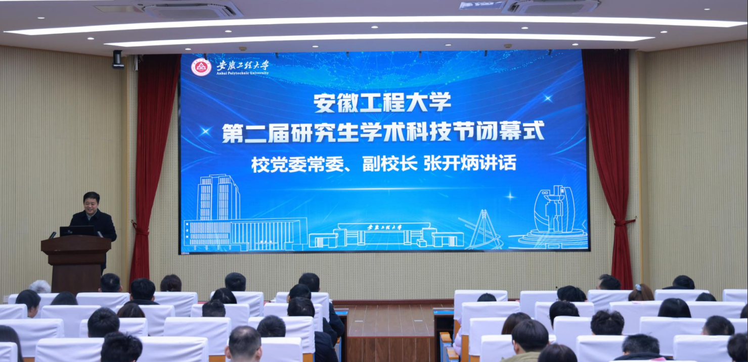 为深入贯彻党的二十大和二十届四中全会精神,积极响应国家创新驱动发展战略,营造浓厚的校园学术创新氛围,1月14日,安徽工程大学第二届研究生学术科技节闭幕式在A座104会议室举行。校党委常委、副校长张开炳出席闭幕式。科技处、研究生部负责人,各学院分管研究生工作负责人、导师代表、研究生秘书、研究生辅导员及获奖学生代表等出席活动。
